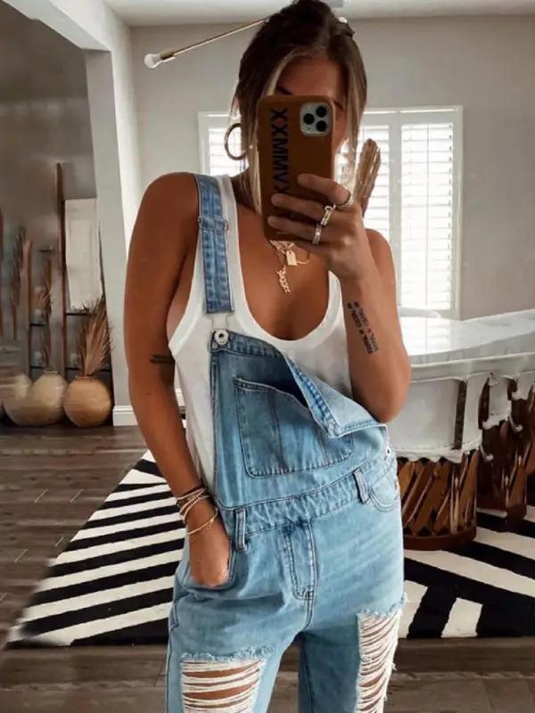 Women's washed ripped blue overalls jeans. Please use the size guide shown in our pictures. Before choosing a size, please read each element of the size guide carefully. Unique design, classic style, casual and comfortable. It is suitable for outing and leisure. The size is measured manually, and the error of 1-3cm is normal.