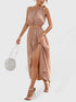 Women's Fashion Slanted Shoulder Bow Knot Set Slit Large Swing Dress Two-Piece Set