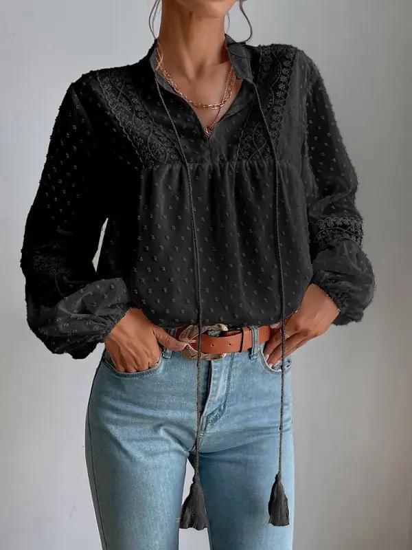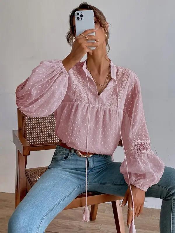 Einfarbige, langärmlige Damenbluse mit geteiltem Ausschnitt und Bindebändern und Spitzenbesatz für Damen
