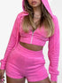 Zweiteiliger Anzug aus goldenem Samt mit Kapuze, langen Ärmeln, Reißverschlussjacke und Shorts für Damen
