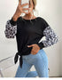Round Neck Long Sleeve Panelled Leopard Print Black Knit Sweater