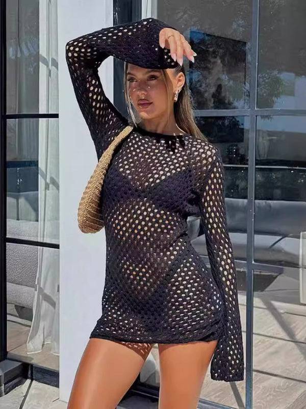 Knitted beach dress sexy hollow backless sun protection clothing seaside holiday bikini blouse