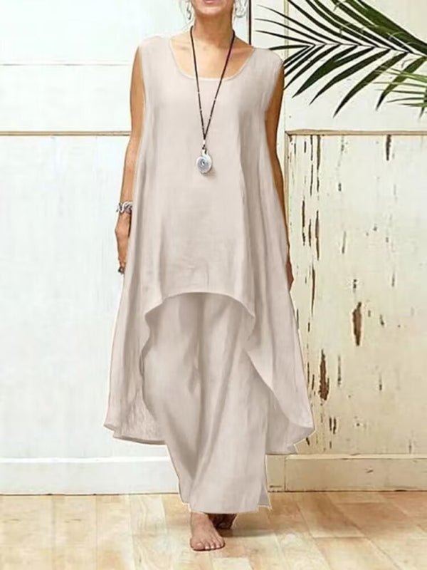 Cotton linen fashion casual irregular sleeveless wide-leg pants two-piece set