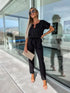 Short-sleeved V-neck slip pocket elastic waist tie-up pencil pants cropped jumpsuit