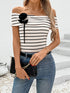 Striped Off-the-shoulder One-shoulder Collar Three-dimensional Flower T-shirt