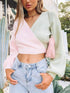 Women's New Contrast Color Splicing Cross-Strap Long Sleeve Loose Knitted Sweater Pullover