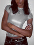Elevate your wardrobe with this Metallic Round Neck Short Sleeve T-Shirt Top. Crafted from a blend of 95% polyester and 5% spandex, this top exudes a sleek and stylish vibe. Perfect for adding a touch of glamour to your casual outings or evening events. So versatile and comfortable, you'll want to wear it everywhere.