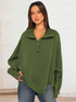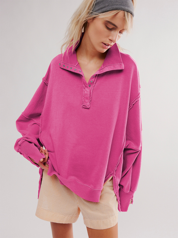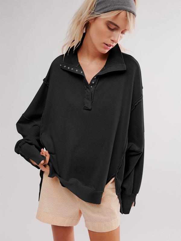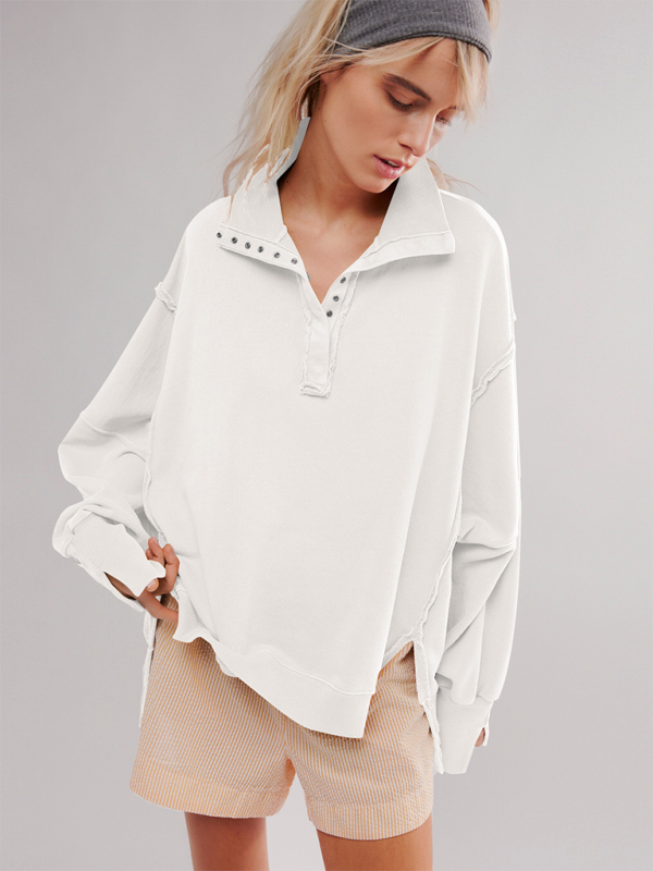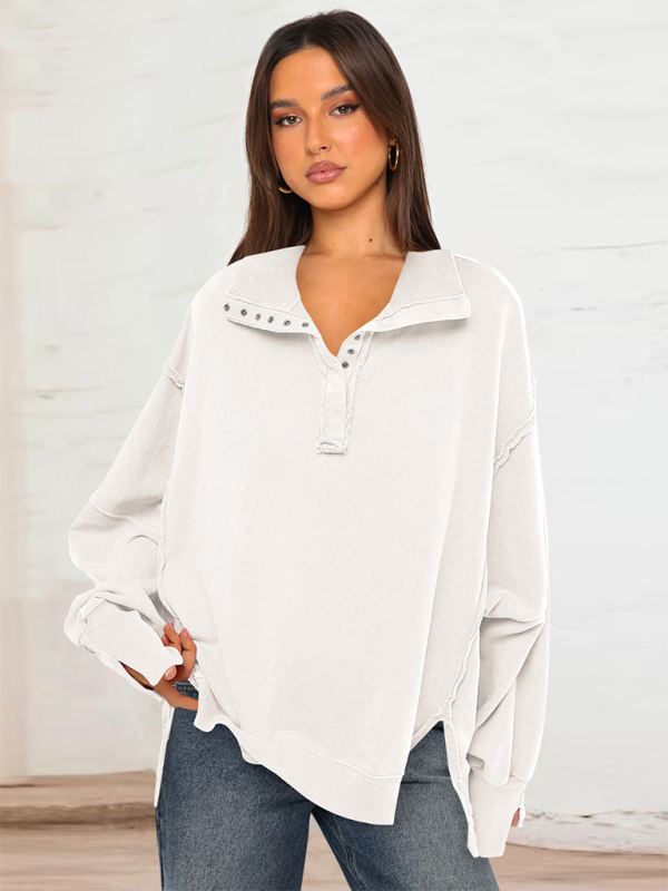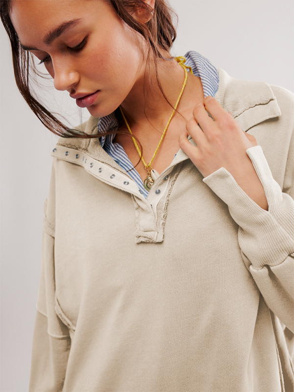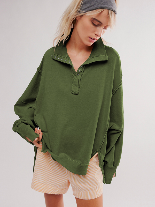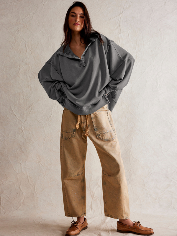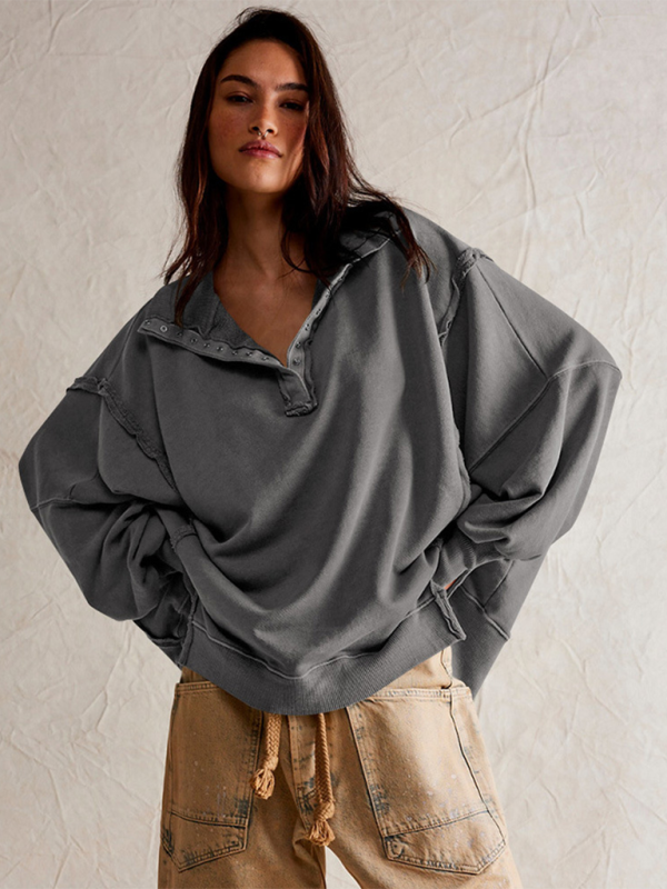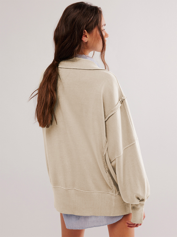 Women's Lantern Sleeve Decorative Lines Split Lapel Loose Sweatshirt