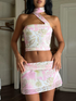 Street style fresh pink new halter neck vest short hip print skirt suit