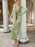 Women's long-sleeved V-neck waist-skimming pleated dress